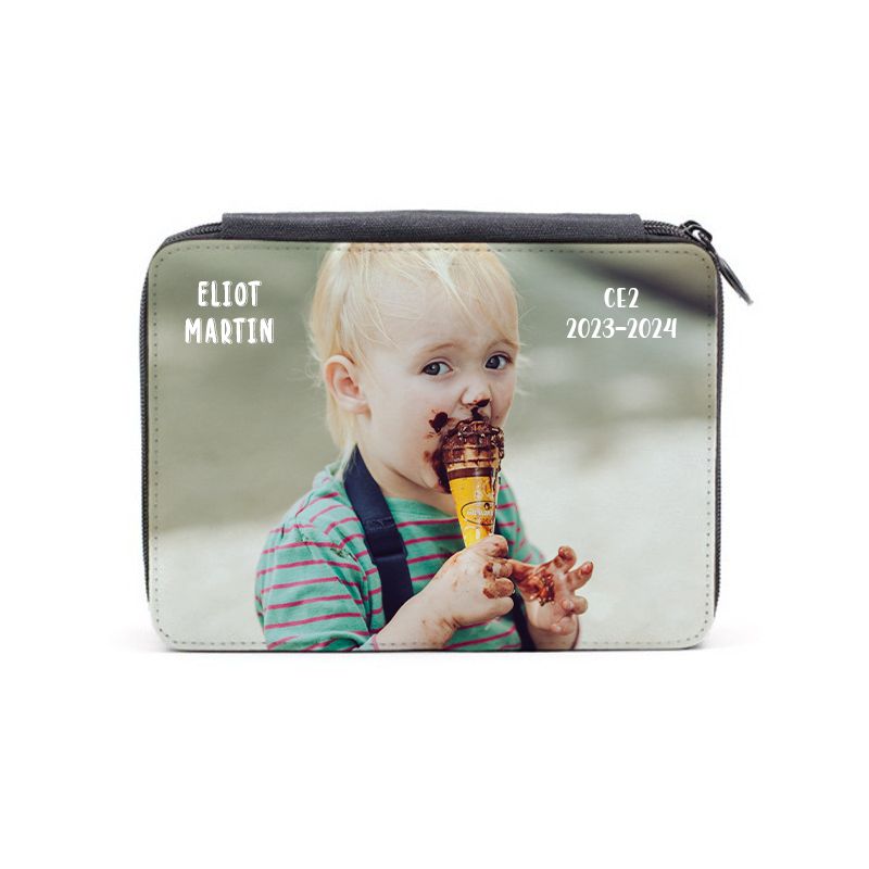 Trousse personnalisée accompagnée de ses crayons et accessoires.